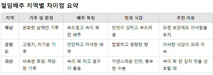 강원도는 높은 고도와 차가운 기후로 유명한 지역입니다. 이곳에서 재배되는 배추는 추운 기후 덕분에 배추잎이 단단하고 속이 알차게 차 있는 것이 특징입니다. 특히 강원도의 평창, 정선, 태백 지역은 청정 고랭지로 배추가 자라기에 최적의 환경을 갖추고 있습니다.